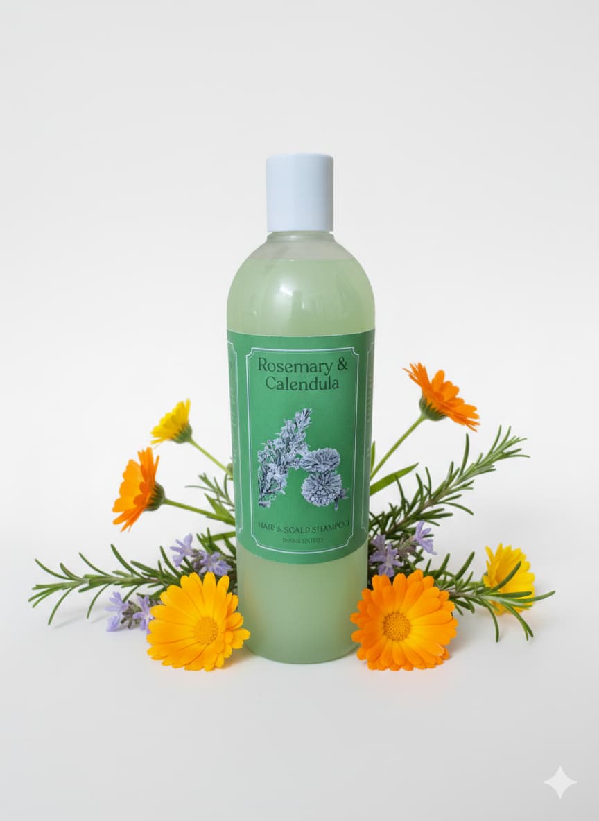 Our Rosemary and Calendula Herbal Hair and Scalp Shampoo uses natural botanical extracts and essential oils to heal as it cleanses your scalp and hair. Some of the botanical extracts, such as aloe, rosemary, vervaine and calendula, boost the cleansing and mildness nature of our balanced blend of surfactants to your hair and scalp. Essential oils of lemongrass stimulate your scalp and hair follicles to increase microcirculation and boost hair growth, as tea tree and eucalyptus detoxify to maintain a healthy microbiome.